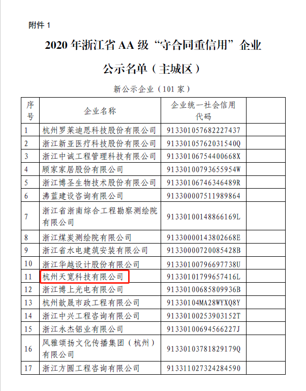 近日,2020年浙江省AA級(jí)“守合同重信用”企業(yè)名單公示,天寬榜上有名。這也是公司首次申報(bào)浙江省“守合同重信用”企業(yè),并獲準(zhǔn)直接參加AA級(jí)評(píng)定。