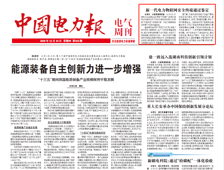 12月10日,《中國電力報》頭版刊發(fā)了關(guān)于天寬順利通過產(chǎn)品鑒定會的詳細(xì)報道。