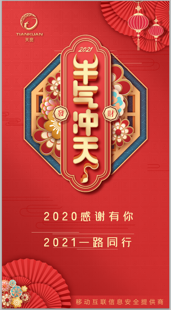 新元復(fù)始,萬象更新。在辭舊迎新之際,杭州天寬科技有限公司向所有的客戶、合作伙伴、股東和公司員工,以及關(guān)心和支持天寬發(fā)展的社會各界友人,致以最誠摯的祝福和最衷心的感謝!2020年,是極不平凡、充滿挑戰(zhàn)的一年,天寬牢牢把握信息安全行業(yè)發(fā)展的歷史機(jī)遇,充分發(fā)揮自主研發(fā)與技術(shù)創(chuàng)新的優(yōu)勢,以優(yōu)質(zhì)的產(chǎn)品和服務(wù)持續(xù)為客戶創(chuàng)造價(jià)值。這一年,在疫情的沖擊下,公司逆勢而上,取得了令人鼓舞的業(yè)績,凈利潤同比增長超過80%。市場占有率進(jìn)一步提升,交付了多個(gè)十萬用戶數(shù)以上的大型項(xiàng)目;與浙江移動共同推出了“云端安全管控”產(chǎn)品,實(shí)現(xiàn)了產(chǎn)品及商業(yè)模式的創(chuàng)新;同時(shí),我們?yōu)殡娏π袠I(yè)定制的天寬“新一代電力物聯(lián)網(wǎng)安全終端”在中電聯(lián)產(chǎn)品技術(shù)鑒定會上獲得國內(nèi)領(lǐng)先、國際先進(jìn)的高度評價(jià),產(chǎn)品已經(jīng)廣泛的在國網(wǎng)及南網(wǎng)各個(gè)省份得到規(guī)模商用,累積用戶數(shù)超過十萬。這一年,公司獲得了全球軟件領(lǐng)域最高級別CMMI5級認(rèn)證,中國網(wǎng)絡(luò)安全企業(yè)100強(qiáng),浙江省電子信息50家成長型企業(yè)等諸多榮譽(yù),參與國家等保2.0相關(guān)標(biāo)準(zhǔn)的撰寫,并獲得西湖區(qū)科創(chuàng)直投基金千萬級投資,以及更多同行者的全方位支持。2021年,我們團(tuán)結(jié)一心,攜手共進(jìn),開啟新征程。天寬將在保持營業(yè)收入與凈利潤持續(xù)增長的同時(shí),積極加強(qiáng)和國家相關(guān)科研機(jī)構(gòu)合作,通過技術(shù)研究、項(xiàng)目實(shí)踐,進(jìn)一步提升移動互聯(lián)網(wǎng)/物聯(lián)網(wǎng)安全、數(shù)據(jù)安全治理、數(shù)據(jù)安全服務(wù)等領(lǐng)域的自主研發(fā)能力,夯實(shí)移動互聯(lián)信息安全領(lǐng)域的龍頭地位,使公司成為行業(yè)一流、國內(nèi)知名的具有競爭力和影響力的移動信息安全企業(yè)。以更貼合客戶場景的行業(yè)解決方案與安全服務(wù),為電力、司法以及其他行業(yè)的客戶移動業(yè)務(wù)發(fā)展保駕護(hù)航。最后,再次送上最誠摯的問候和最衷心的祝福,祝大家在新的一年里身體健康,工作順利,闔家幸福!