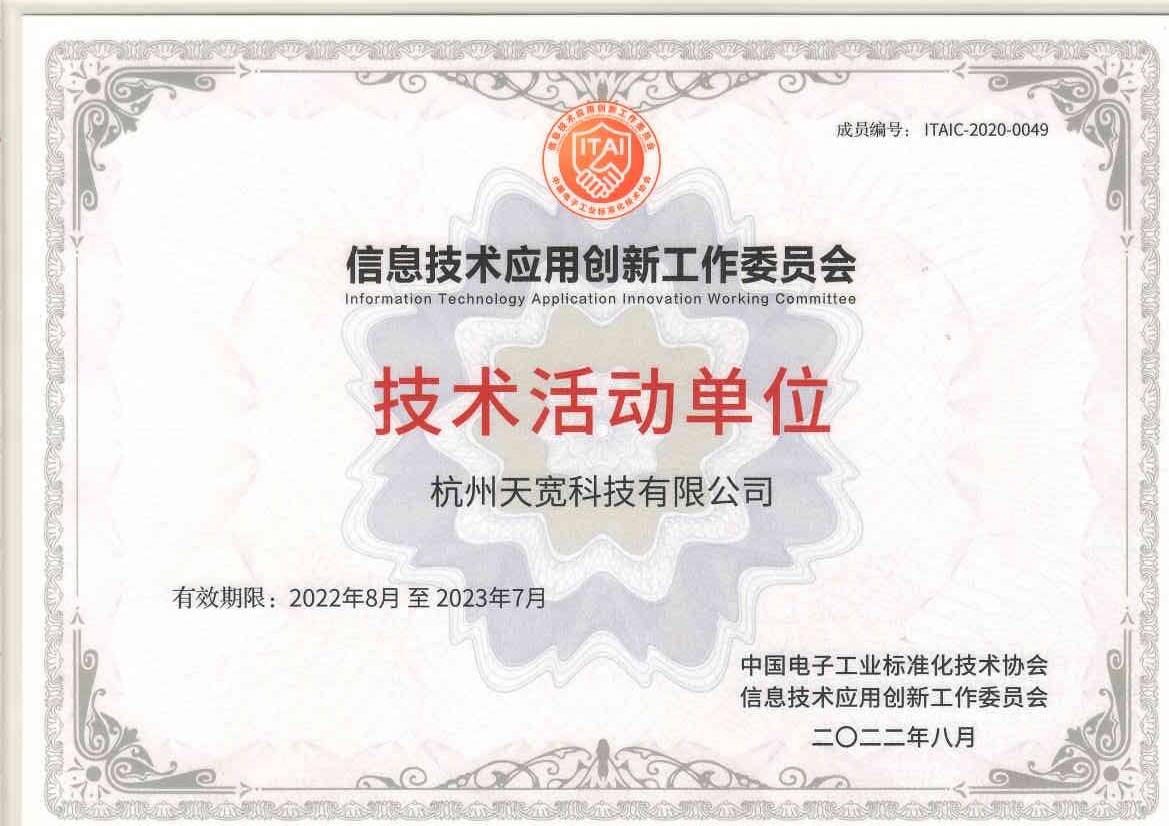 近日,天寬榮獲中國(guó)電子工業(yè)標(biāo)準(zhǔn)化技術(shù)協(xié)會(huì)、信息技術(shù)應(yīng)用創(chuàng)新工作委員會(huì)(以下簡(jiǎn)稱(chēng)信創(chuàng)工委會(huì))聯(lián)合頒發(fā)的《信息技術(shù)應(yīng)用創(chuàng)新工作委會(huì)員技術(shù)活動(dòng)單位》證書(shū)。該證書(shū)主要頒發(fā)給持續(xù)技術(shù)創(chuàng)新活躍度較高的信創(chuàng)工委員成員單位,是對(duì)堅(jiān)持持續(xù)創(chuàng)新類(lèi)會(huì)員單位的肯定。
