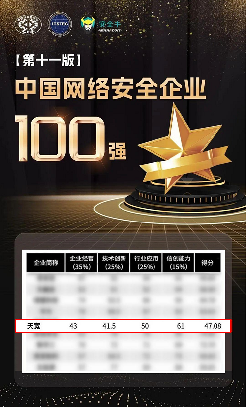 近日,第十一版《中國網(wǎng)絡(luò)安全企業(yè)100強(qiáng)》正式發(fā)布。天寬憑借行業(yè)領(lǐng)先的技術(shù)創(chuàng)新能力、持續(xù)經(jīng)營能力、品牌及市場影響力連續(xù)4年上榜百強(qiáng)榜單!